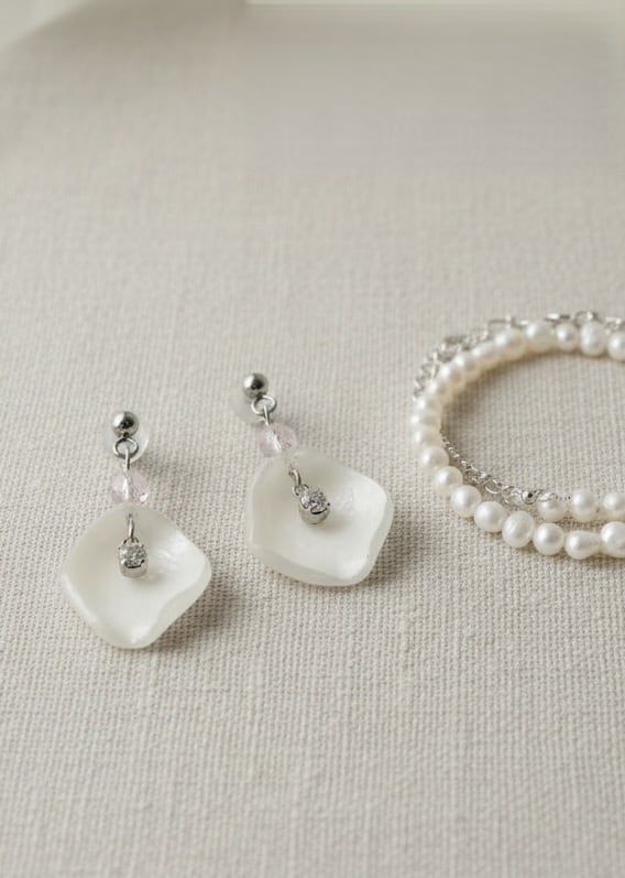 ほんのりと色づく淡いピンクのモルガナイトが、大人の肌に上品な血色感と優しさをプラス。揺れるたびに煌めく細やかなパーツが、しなやかな女性らしさを演出します。