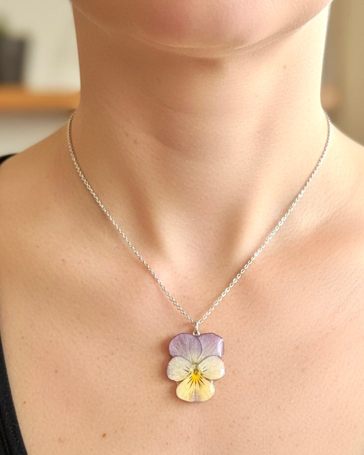本物のビオラを、一番美しい瞬間のまま艶やかなレジンで閉じ込めたハンドメイドネックレスです。