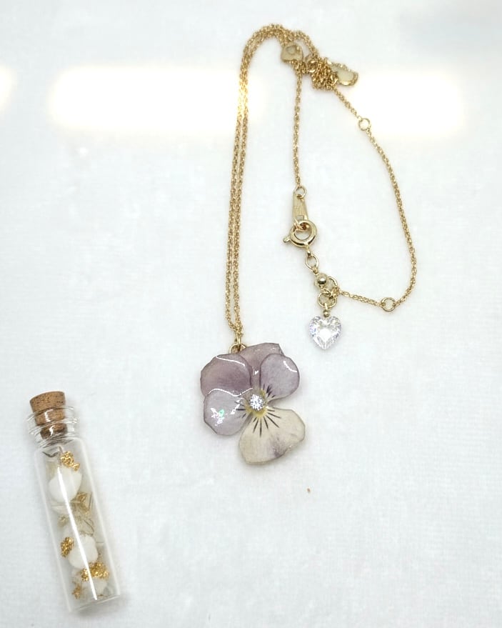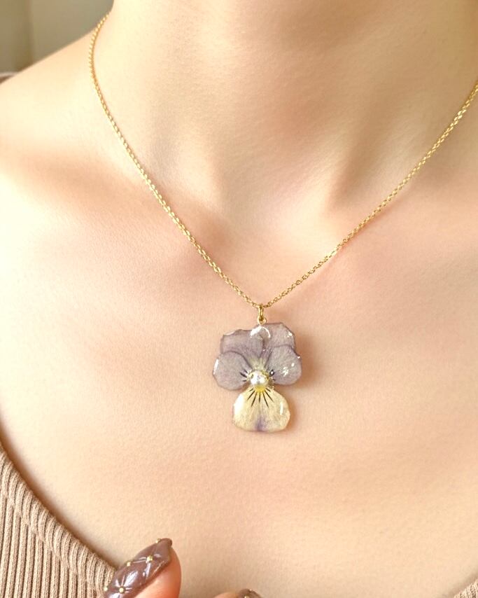 本物のビオラを一番美しい瞬間のまま、艶やかなレジンで閉じ込めたハンドメイドネックレスです。