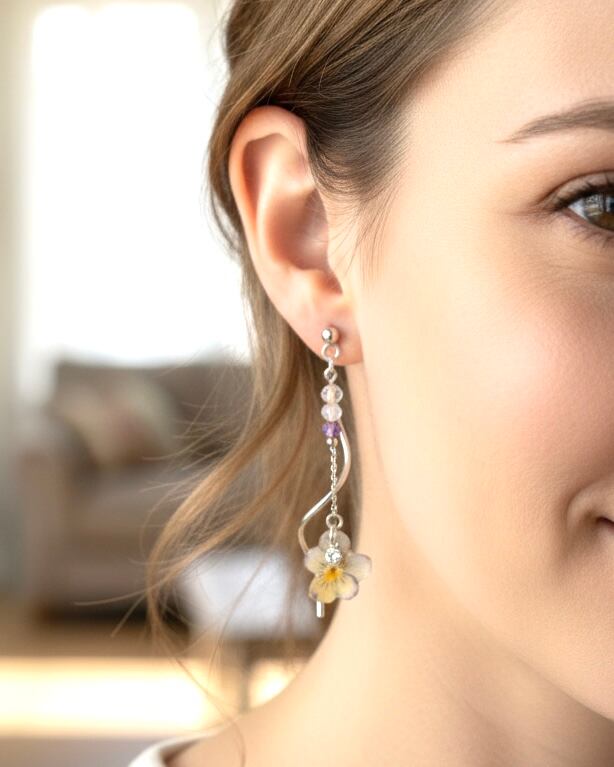 本物のビオラの一番美しい瞬間をそのままに、天然石のフローライトが軽やかに揺れる、知性と品格を兼ね備えたジュエリーに仕立てました。
