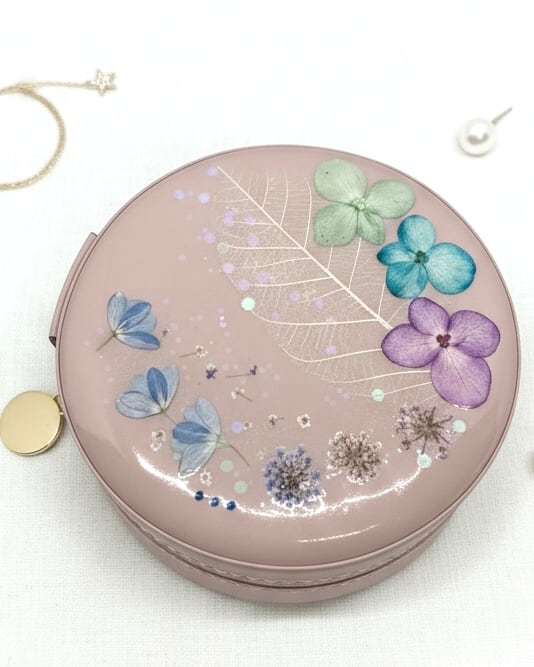 レザー調のケースに、色鮮やかな本物の花々を閉じ込めた、ラウンドタイプのアクセサリーボックスです。